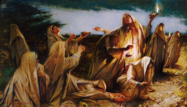 Aquí, está hablando Jesús de las costumbres judías en que, la novia invitaba a sus diez amigas, para que, con sus lámparas encendidas, vayan en el séquito de la boda, la noche de los esponsales. Todas van alegres con su luz, dando con ella mayor alegría a la fiesta. ¡Pero ay, el novio tarda, seguro que, por qué tenía que cumplimentar a muchos invitados! Y las vírgenes comienzan a sentir el tedio de la espera en que nada especial sucede. Así, las lámparas se fueron apagando y todas se durmieron. Pero a media noche: “¡Qué llega el esposo, salid a recibirlo!” Y, todas presurosas encienden sus lámparas, pero cinco de estas doncellas, no llevaban aceite de repuesto y se les apagó la luz.