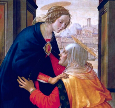 María no sólo obedece con amor la oferta de Dios de ser la Madre de su Hijo, sino que también obedece a la insinuación de que su prima Isabel, anciana, necesita ser ayudada. A prisa y sin demora, se pone en camino hacia la montaña, a una ciudad de Judá. Como Ain Karim está a pocos kilómetros de Jerusalén, aprovecharía una de las muchas caravanas que partían hacia la Ciudad Santa. María está inquieta deseando ver, por sus propios ojos, el milagro de la fecundidad de su prima. Pero Ella lleva ya a Jesús en sus entrañas y es el Santificador el que santifica y quien bendice, y esto recién engendrado en el seno de María.