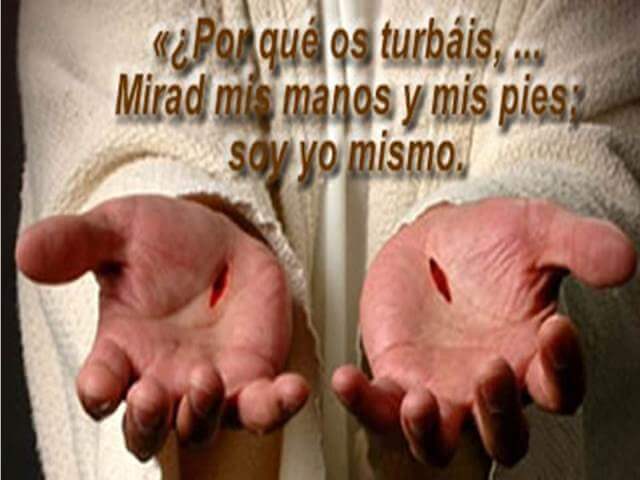 Las apariciones de Jesús Resucitado a sus discípulos, en un primer momento, no les produce alegría y paz,sino aturdimiento y miedo. La realidad de un cuerpo resucitado, y por tanto glorioso, no es algo que el hombre haya experimentado en su vida, por esto, Jesús, lo primero que les da a sus amigos es “la Paz”. La que Él posee y por ello, puede darla. Pero, ésta, no es bastante. Ha de apelar Jesús a todos sus sentidos: “mirad mis manos y mis pies: ¡soy Yo en persona!”. Pero su voz, todavía no les tranquiliza. Entonces, loslleva hasta el tacto: “palpadme con mis huesos y carne. Un espíritu no tiene esto, ¡soy Yo!”. Y, por último,les pide algo de comer, como hace todo hombre que gusta y mastica los alimentos... ¡Realmente, ante estasrevelaciones de Jesús acerca de su Cuerpo Resucitado, nos deja sin palabras! Y, esto, porque quiere que demos un salto de gigante hacia la fe. Ella, es la única que puede certificarnos todas estas cosas que, escapan a la percepción de todo hombre.