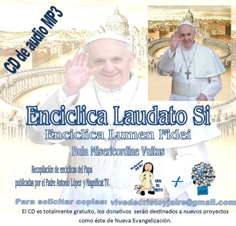 Pero, como esta familia no somos sólo el monasterio sino todos los que leéis el reto, os hemos hecho un CD con el audio de las encíclicas "Laudato Si" y "Lumen fidei", y la bula "Misericordiae Vultus" para todo el que quiera. Puedes escucharlo en el coche mientras vas a trabajar, o en la cocina mientras preparas la comida o mientras planchas... Haciendo lo que todos los días haces.