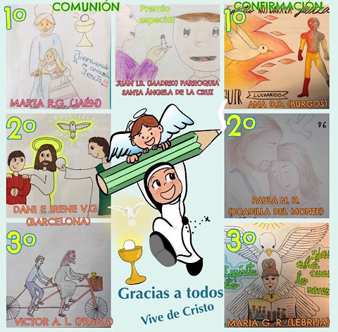 Muchos de vuestros dibujos nos han ayudado... ¡a orar! (¡sí, a las monjas!). Tenéis un corazón que sabe mirar, que no pone por delante la razón y ve más allá. Muchos estaréis esperando el resultado del concurso, y nos gustaría poner el nombre de cada uno de vosotros en el Primer Premio, y el nombre de vuestros padres, catequistas y sacerdotes... pero, al ser un concurso de dibujo, será inevitable nombrar tan solo a algunos, aunque la verdad es que... ¡todos lo habéis ganado! Y te aseguro que no es el típico dicho para que te quedes contento.