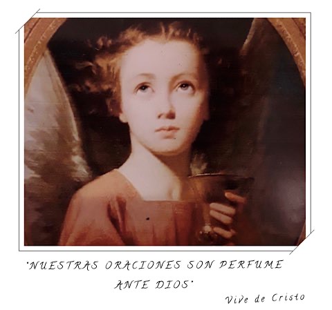 El día de mi cumpleaños, una amiga me envió la imagen de este ángel, ¡tan bello y delicado! En sus manos sostiene una copa de oro y en su mirada, hacia el cielo, parece ofrecerle a Dios los aromas e incienso que suben de la copa… ¡Me gustaba tanto, que lo he puesto en la pasta de mi libreta de oración, y así me acompaña de continuo y lo puedo mirar y contemplar sin cansarme, porque es más lo que evoca, que lo que representa!…