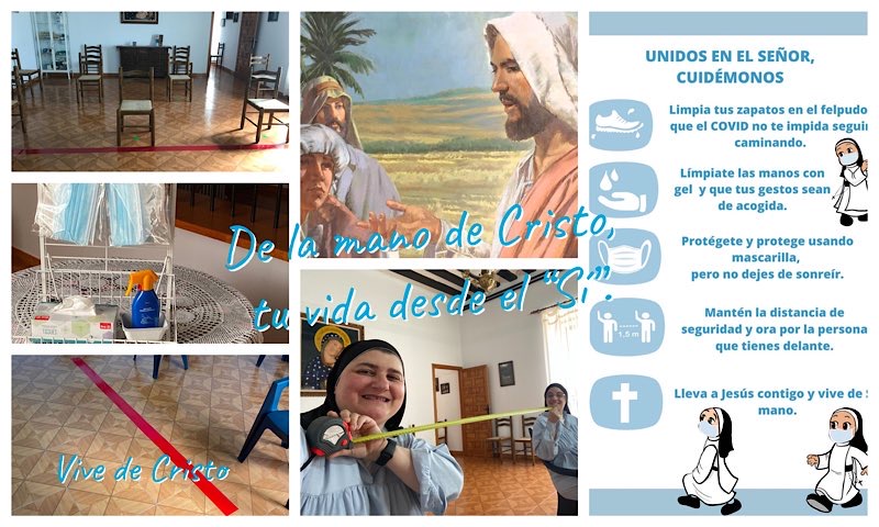 A lo largo de esta semana, hemos estado habilitando las distintas zonas del Monasterio a la “nueva normalidad”. Delimitaciones de distancia en los locutorios, tienda e iglesia, separación de sillas, puntos de higiene...
