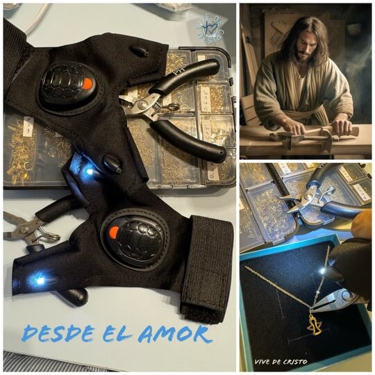 Me regaló unos guantes que en la punta de los dos dedos centrales tienen una luz led. Son especiales para diseñar pulseras, collares, gargantillas… o para cuando necesitas soldar anillas, desmontar los relojes para grabar con la máquina láser... Son súper útiles y originales para mi trabajo. Lo original que tienen es que la luz te acompaña y te facilita el trabajo. La realidad es que el amor es lo único que hace nuevas todas las cosas.