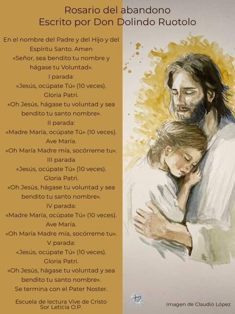 En el Rosario del abandono encuentro una gran paz. Es un Rosario especial, donde recitas diez veces la frase: “Jesús, ocúpate tú”. Al repetir esta frase una y otra vez, te das cuenta de lo que te está preocupando, aquello que te quita la paz y que no te deja descansar. Y mientras tus labios lo recitan, tu corazón se va ablandando y poco a poco dejas paso a Jesús en tu vida para que Él se ocupe.