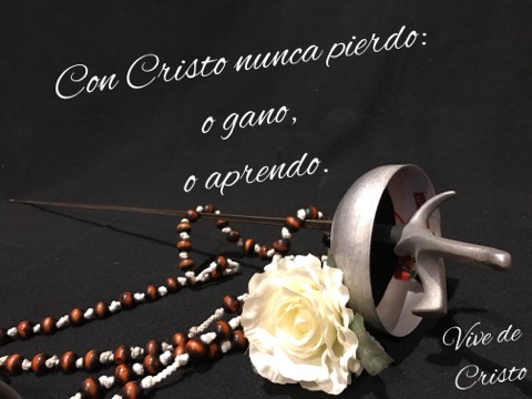 El otro día estaba trabajando en la sala y, de pronto, vi que Sión le quitaba al angel la espada que tiene en la mano (que es la mía, de las competiciones de esgrima). Luego vi que cogía mi rosario y, por último, una rosa blanca. Acto seguido se puso en el suelo a hacer fotos y, al rato, vino con una imagen en la que salen la espada, el rosario y la rosa, acompañados de una frase que dice: "Con Cristo nunca pierdo: o gano, o aprendo".