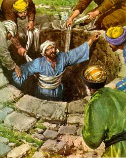 6 Ellos se apoderaron de Jeremías, y lo echaron a la cisterna de Malkiyías, hijo del rey, que había en el patio de la guardia, descolgando a Jeremías con sogas. En el pozo no había agua, sino fango, y Jeremías se hundió en el fango.