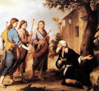 -El lugar del suceso es Hebrón, luego santuario célebre. Con una sola frase el (J) nos ha situado en lugar y tiempo, Súbitamente aparecen tres hombres: lo divino siempre aparece por sorpresa. Abrahán les corta el paso y ellos se paran como deseando ser recibidos. La invitación es muy respetuosa y encarecida: ADONI = “Señor mío” y “si he encontrado gracia”, dos fórmulas de cortesía en las que no se ve que todavía Abrahán haya reconocido a Jahvé. La aceptación es breve y casi condescendiente.