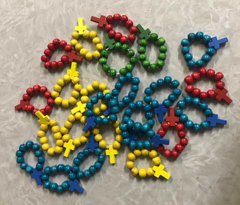 Pero de pronto pensamos que “tal vez viene alguien sin rosario”. Bueno, pues... ¡manos a la obra! Esta semana nos hemos puesto todas juntas a montar rosarios pequeñitos, para que, todo el que venga a ver a María, pueda llevarse su rosario. Ahora aparecen bolitas de colores por cualquier parte de la sala... Cosas de las prisas, porque... ¡ya no falta nada!