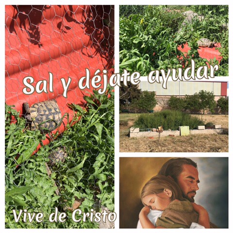 En la huerta, justo en medio, está el terrario de las tortugas. Este año ha crecido muchísimo la hierba y pueden estar a sus anchas. Tienen unos pequeños refugios para cobijarse y, con la hierba, ahora es imposible verlas a no ser que salgan a tu encuentro.
